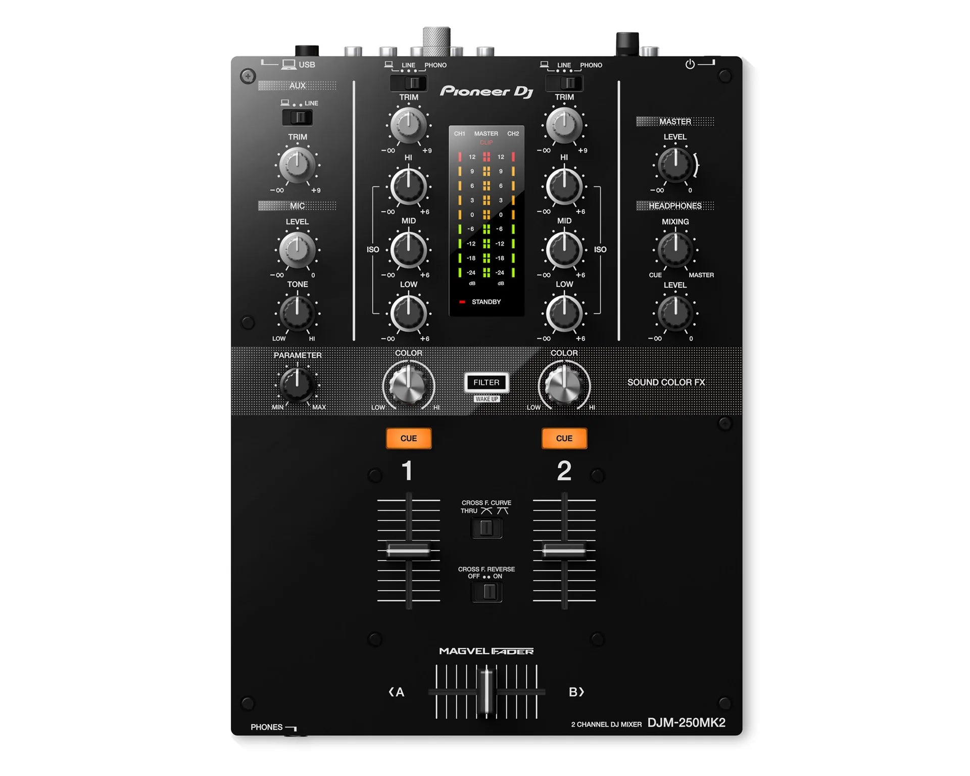 The DJM-250MK2 has inherited some of the professional features of the popular DJM-900NXS2, such as the Magvel crossfader and Sound Color FX filter. Straightforward controls, a clear layout, and dedicated 3-band isolators let you scratch and mix instinctively.